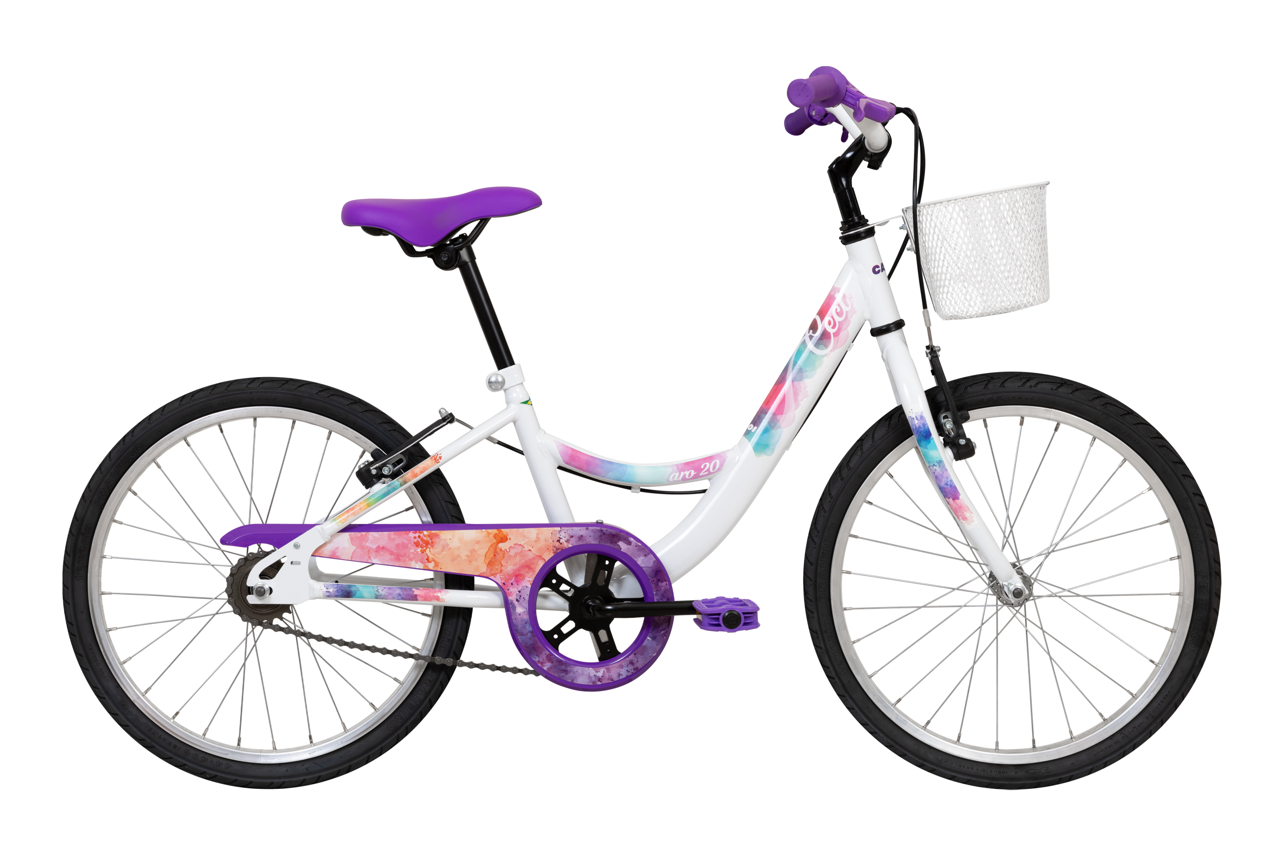 Para ciclistas mirins com muito estilo desfilarem pelos parques com uma bicicleta que expressa sua alma criativa! O quadro curvado facilita montar e desmontar da bike, e favorece uma postura relaxada. Para um pedal seguro e tranquilo, a manopla impede que a mão escorregue para fora do guidão, e o protetor de corrente protege contra batidas e arranhões acidentais das pernas ou pés. Além disso, o cesto multiuso traz um charme a mais para quem quer pedalar sendo o centro das atenções.